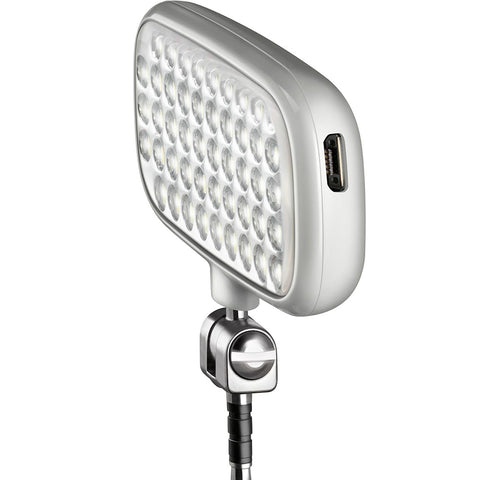 With energy up to 4 hours, the video light is powered by a lithium battery, which is charged via an integrated USB socket. On a small area, the mecalight LED-72smart provides plenty of light for taking selfies. Its light function can be selected via a button on the back in 3 levels: full power, reduced power and flashing.
